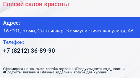 Елисей, салон красоты по адресу 167001, Коми, Сыктывкар, Коммунистическая улица, 46 в дальнейшем Организация, размещена в следующих категориях: