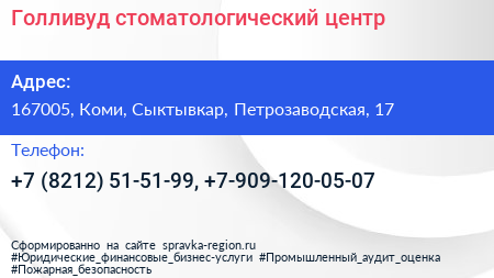 Голливуд, стоматологический центр по адресу 167005, Коми, Сыктывкар, Петрозаводская, 17 в дальнейшем Организация, размещена в следующих категориях: