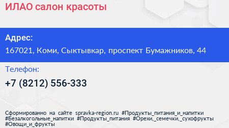 ИЛАО, салон красоты по адресу 167021, Коми, Сыктывкар, проспект Бумажников, 44 в дальнейшем Организация, размещена в следующих категориях: