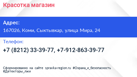 Красотка, магазин по адресу 167026, Коми, Сыктывкар, улица Мира, 24 в дальнейшем Организация, размещена в следующих категориях: