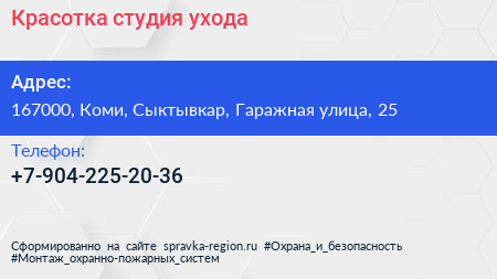 Красотка, студия ухода по адресу 167000, Коми, Сыктывкар, Гаражная улица, 25 в дальнейшем Организация, размещена в следующих категориях: