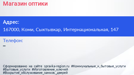 Магазин оптики по адресу 167000, Коми, Сыктывкар, Интернациональная, 147 в дальнейшем Организация, размещена в следующих категориях: