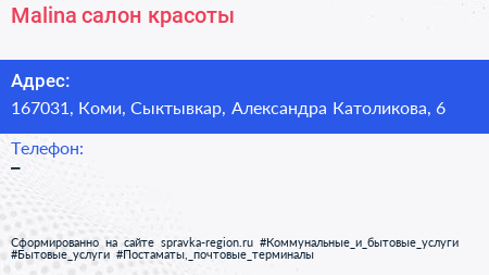 Malina, салон красоты по адресу 167031, Коми, Сыктывкар, Александра Католикова, 6 в дальнейшем Организация, размещена в следующих категориях: