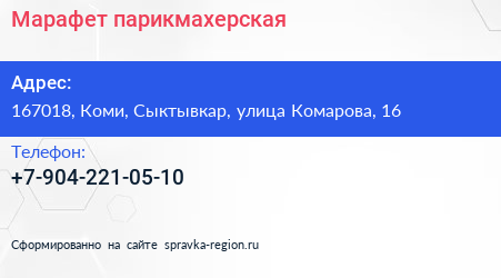 Марафет, парикмахерская по адресу 167018, Коми, Сыктывкар, улица Комарова, 16 в дальнейшем Организация, размещена в следующих категориях: