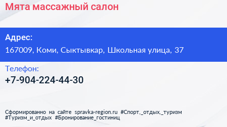 Мята, массажный салон по адресу 167009, Коми, Сыктывкар, Школьная улица, 37 в дальнейшем Организация, размещена в следующих категориях: