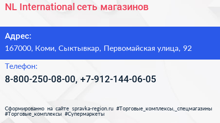 NL International, сеть магазинов по адресу 167000, Коми, Сыктывкар, Первомайская улица, 92 в дальнейшем Организация, размещена в следующих категориях: