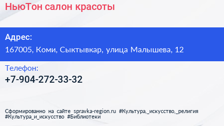 НьюТон, салон красоты по адресу 167005, Коми, Сыктывкар, улица Малышева, 12 в дальнейшем Организация, размещена в следующих категориях: