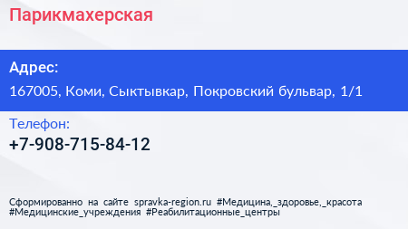 Парикмахерская по адресу 167005, Коми, Сыктывкар, Покровский бульвар, 1/1 в дальнейшем Организация, размещена в следующих категориях: