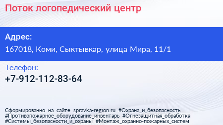 Поток, логопедический центр по адресу 167018, Коми, Сыктывкар, улица Мира, 11/1 в дальнейшем Организация, размещена в следующих категориях: