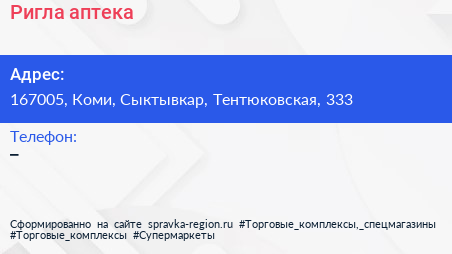 Ригла, аптека по адресу 167005, Коми, Сыктывкар, Тентюковская, 333 в дальнейшем Организация, размещена в следующих категориях: