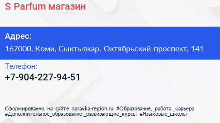 S-Parfum, магазин по адресу 167000, Коми, Сыктывкар, Октябрьский проспект, 141 в дальнейшем Организация, размещена в следующих категориях:
