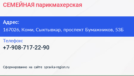 СЕМЕЙНАЯ, парикмахерская по адресу 167026, Коми, Сыктывкар, проспект Бумажников, 53Б в дальнейшем Организация, размещена в следующих категориях: