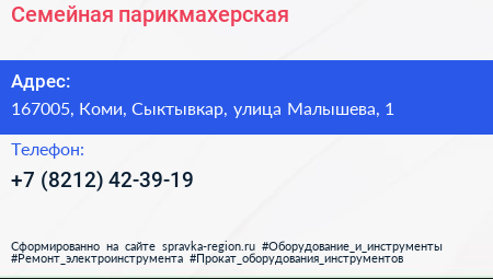 Семейная, парикмахерская по адресу 167005, Коми, Сыктывкар, улица Малышева, 1 в дальнейшем Организация, размещена в следующих категориях: