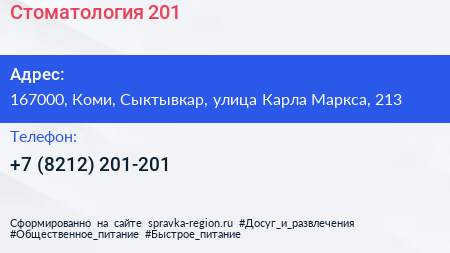 Стоматология-201 по адресу 167000, Коми, Сыктывкар, улица Карла Маркса, 213 в дальнейшем Организация, размещена в следующих категориях: