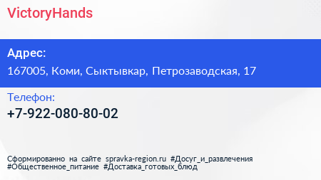 VictoryHands по адресу 167005, Коми, Сыктывкар, Петрозаводская, 17 в дальнейшем Организация, размещена в следующих категориях: