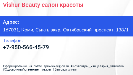 Vishur Beauty, салон красоты по адресу 167031, Коми, Сыктывкар, Октябрьский проспект, 138/1 в дальнейшем Организация, размещена в следующих категориях: