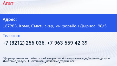 Агат по адресу 167983, Коми, Сыктывкар, микрорайон Дырнос, 98/5 в дальнейшем Организация, размещена в следующих категориях: