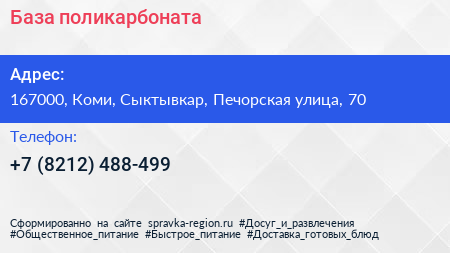 База поликарбоната по адресу 167000, Коми, Сыктывкар, Печорская улица, 70 в дальнейшем Организация, размещена в следующих категориях:
