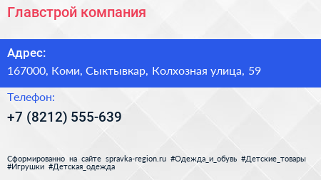 Главстрой, компания по адресу 167000, Коми, Сыктывкар, Колхозная улица, 59 в дальнейшем Организация, размещена в следующих категориях: