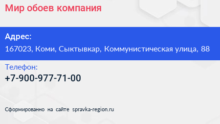 Мир обоев, компания по адресу 167023, Коми, Сыктывкар, Коммунистическая улица, 88 в дальнейшем Организация, размещена в следующих категориях: