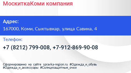 МоскиткаКоми, компания по адресу 167000, Коми, Сыктывкар, улица Савина, 4 в дальнейшем Организация, размещена в следующих категориях: