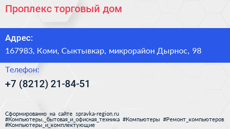 Проплекс, торговый дом по адресу 167983, Коми, Сыктывкар, микрорайон Дырнос, 98 в дальнейшем Организация, размещена в следующих категориях: