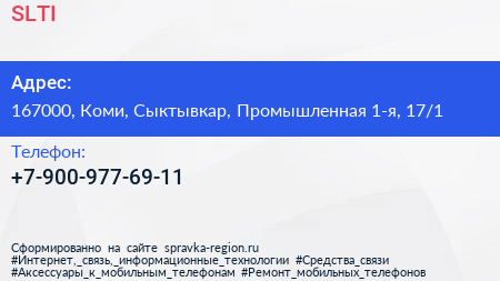 SLTI по адресу 167000, Коми, Сыктывкар, Промышленная 1-я, 17/1 в дальнейшем Организация, размещена в следующих категориях:
