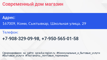 Современный дом, магазин по адресу 167009, Коми, Сыктывкар, Школьная улица, 29 в дальнейшем Организация, размещена в следующих категориях: