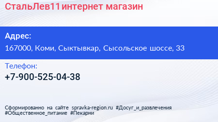 СтальЛев11, интернет-магазин по адресу 167000, Коми, Сыктывкар, Сысольское шоссе, 33 в дальнейшем Организация, размещена в следующих категориях: