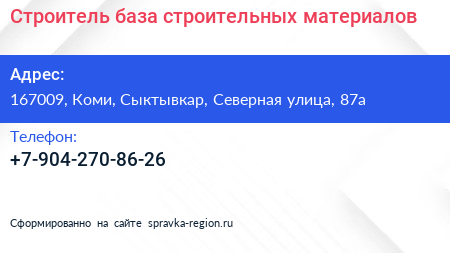 Строитель, база строительных материалов по адресу 167009, Коми, Сыктывкар, Северная улица, 87а в дальнейшем Организация, размещена в следующих категориях: