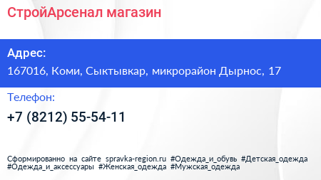 СтройАрсенал, магазин по адресу 167016, Коми, Сыктывкар, микрорайон Дырнос, 17 в дальнейшем Организация, размещена в следующих категориях: