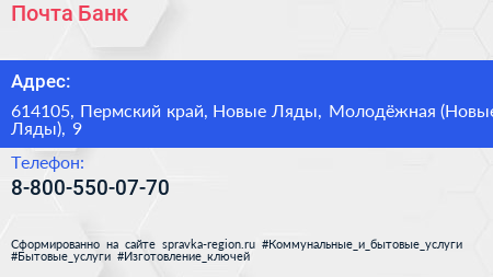 Почта Банк по адресу 614105, Пермский край, Новые Ляды, Молодёжная (Новые Ляды), 9 в дальнейшем Организация, размещена в следующих категориях: