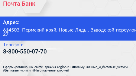 Почта Банк по адресу 614503, Пермский край, Новые Ляды, Заводской переулок, 27 в дальнейшем Организация, размещена в следующих категориях: