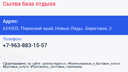 Сылва, база отдыха по адресу 614503, Пермский край, Новые Ляды, Береговая, 2 в дальнейшем Организация, размещена в следующих категориях: