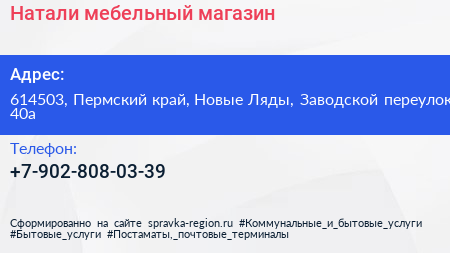 Натали, мебельный магазин по адресу 614503, Пермский край, Новые Ляды, Заводской переулок, 40а в дальнейшем Организация, размещена в следующих категориях:
