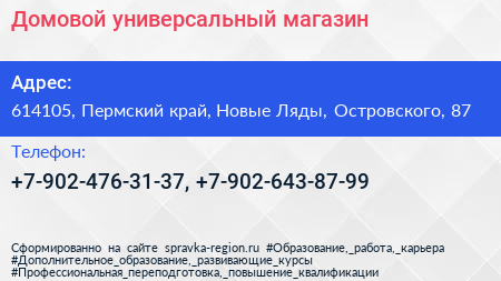 Домовой, универсальный магазин по адресу 614105, Пермский край, Новые Ляды, Островского, 87 в дальнейшем Организация, размещена в следующих категориях: