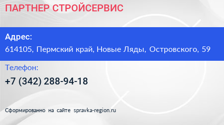 ПАРТНЕР СТРОЙСЕРВИС по адресу 614105, Пермский край, Новые Ляды, Островского, 59 в дальнейшем Организация, размещена в следующих категориях: