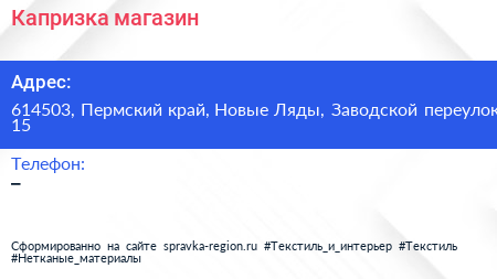 Капризка, магазин по адресу 614503, Пермский край, Новые Ляды, Заводской переулок, 15 в дальнейшем Организация, размещена в следующих категориях: