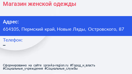 Магазин женской одежды по адресу 614105, Пермский край, Новые Ляды, Островского, 87 в дальнейшем Организация, размещена в следующих категориях: