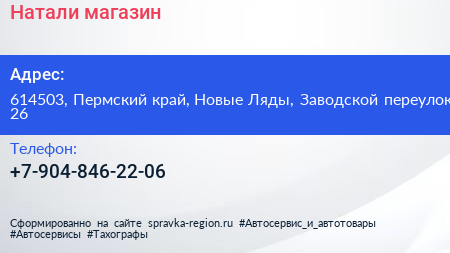 Натали, магазин по адресу 614503, Пермский край, Новые Ляды, Заводской переулок, 26 в дальнейшем Организация, размещена в следующих категориях:
