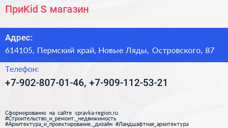 ПриKid`S, магазин по адресу 614105, Пермский край, Новые Ляды, Островского, 87 в дальнейшем Организация, размещена в следующих категориях: