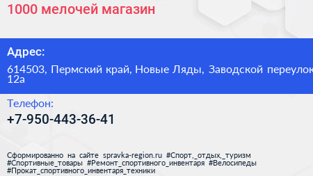 1000 мелочей, магазин по адресу 614503, Пермский край, Новые Ляды, Заводской переулок, 12а в дальнейшем Организация, размещена в следующих категориях: