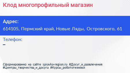Клод, многопрофильный магазин по адресу 614105, Пермский край, Новые Ляды, Островского, 61 в дальнейшем Организация, размещена в следующих категориях:
