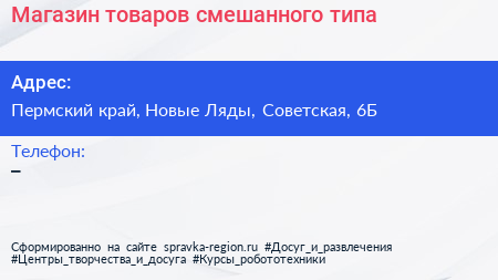 Магазин товаров смешанного типа по адресу Пермский край, Новые Ляды, Советская, 6Б в дальнейшем Организация, размещена в следующих категориях: