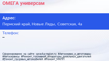ОМЕГА, универсам по адресу Пермский край, Новые Ляды, Советская, 4а в дальнейшем Организация, размещена в следующих категориях: