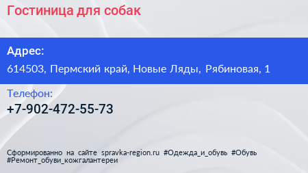 Гостиница для собак по адресу 614503, Пермский край, Новые Ляды, Рябиновая, 1 в дальнейшем Организация, размещена в следующих категориях: