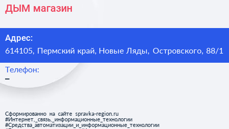 ДЫМ, магазин по адресу 614105, Пермский край, Новые Ляды, Островского, 88/1 в дальнейшем Организация, размещена в следующих категориях: