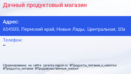Дачный, продуктовый магазин по адресу 614503, Пермский край, Новые Ляды, Центральная, 10а в дальнейшем Организация, размещена в следующих категориях: