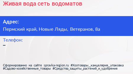 Живая вода, сеть водоматов по адресу Пермский край, Новые Ляды, Ветеранов, 8а в дальнейшем Организация, размещена в следующих категориях: