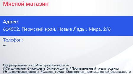 Мясной магазин по адресу 614502, Пермский край, Новые Ляды, Мира, 2/6 в дальнейшем Организация, размещена в следующих категориях: